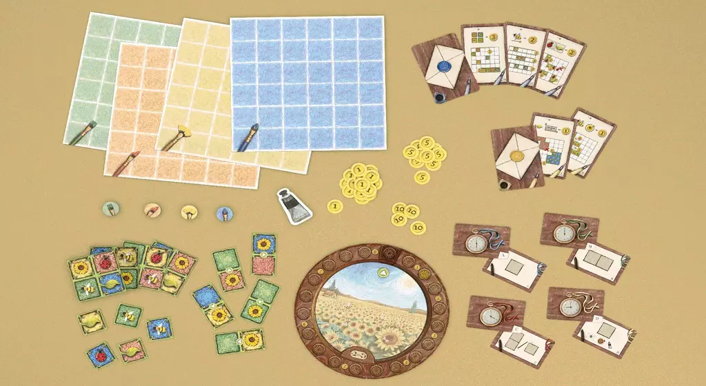 En Girasoles, cada jugador toma losetas del Campo de Girasoles y las acomoda en su tablero personal, intentando hacer la mejor composición posible. Después de 4 rondas, quien haya sumado más puntos se lleva el título de mejor artista. 🏆
